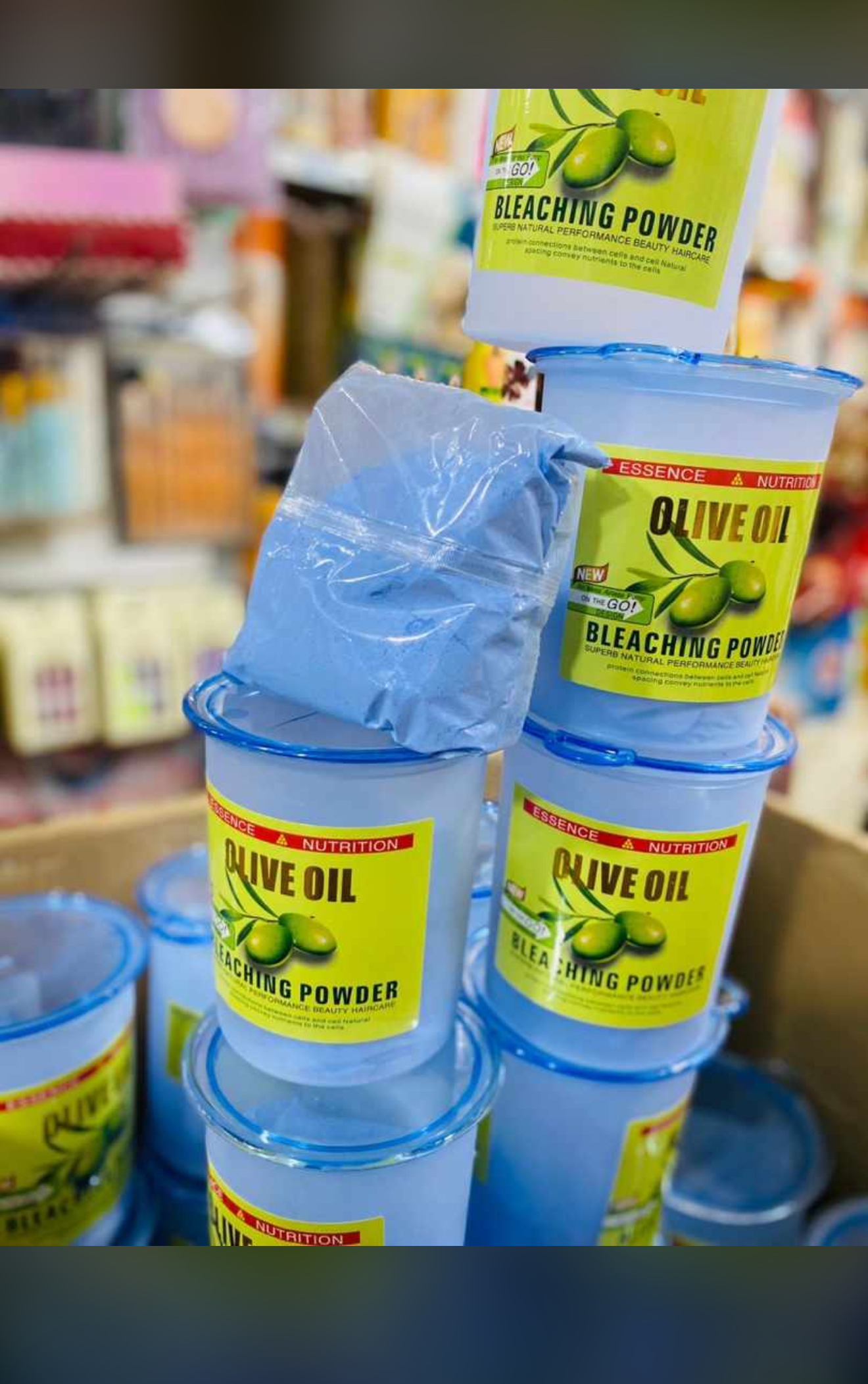 des pots de poudre décolorante “Olive Oil Bleaching Powder” empilés. Chaque pot a un couvercle bleu transparent et est accompagné d’un sachet contenant la poudre bleue à l’intérieur. L’étiquette jaune indique que le produit contient de l’huile d’olive, mettant en avant des bénéfices liés à la nutrition et à l’essence naturelle.